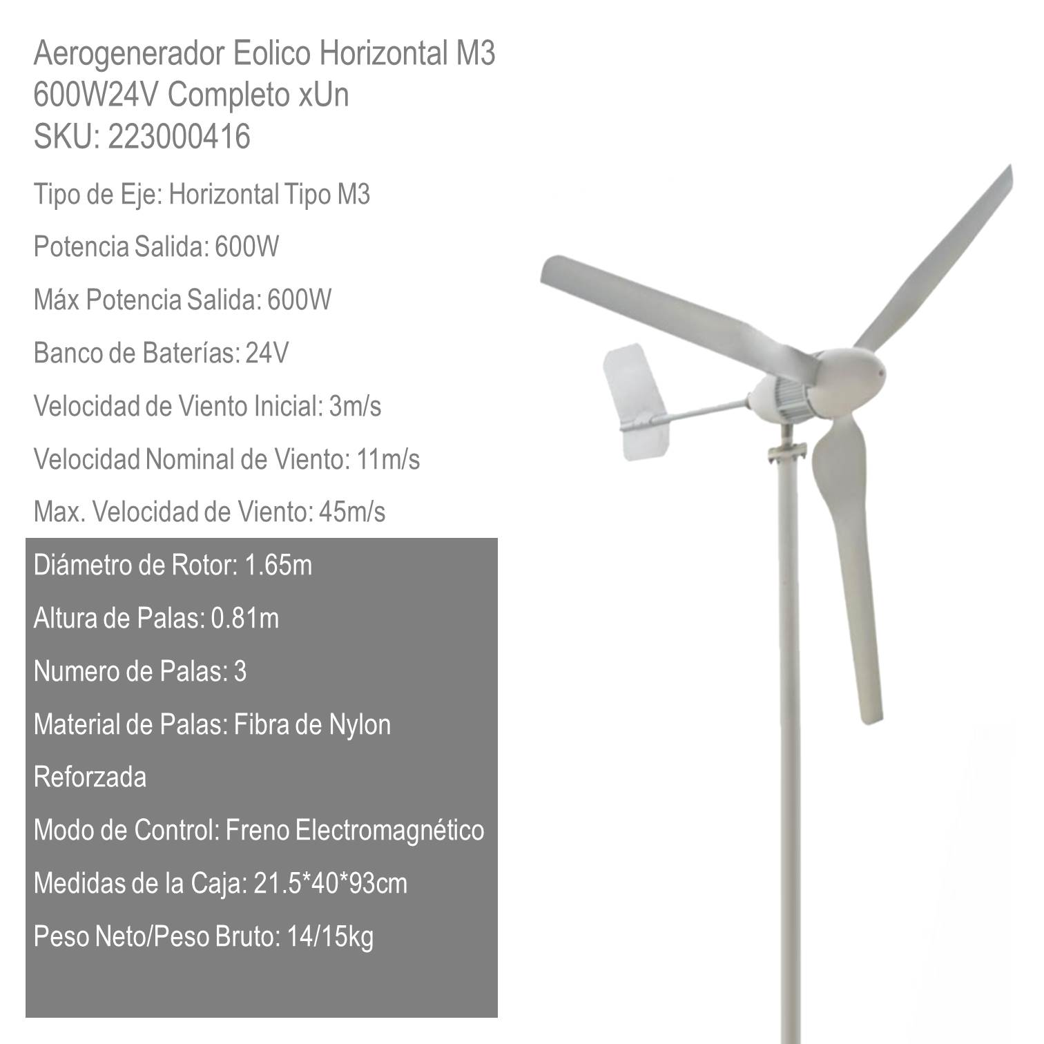 Este aerogenerador eolico horizontal de 1000W a 48V es una solucion robusta y confiable para generar energia limpia en zonas con buen regimen de vientos. Su diseño con tres palas de fibra de nylon reforzada le permite captar viento desde tan solo 3 m/s y trabajar de forma optima a partir de 11 m/s, soportando velocidades extremas de hasta 45 m/s sin comprometer su estructura gracias a su freno electromagnetico incorporado. Es ideal para instalaciones off-grid en cabañas, campos, chacras o sistemas hibridos solar-eolico. No incluye torre debido a las limitaciones de envio, pero te brindamos asesoramiento para que puedas fabricarla de forma simple en destino. Todos los equipos incluyen una brida de conexion con agujeros, lista para soldar a un caño de acero galvanizado de 2 pulgadas (60,3 mm) con espesor de 4 mm. Estos caños vienen en tramos estandar de 6,40 m. Solo hay que soldar la brida, realizar 4 escuadras de refuerzo y montar sobre base firme.