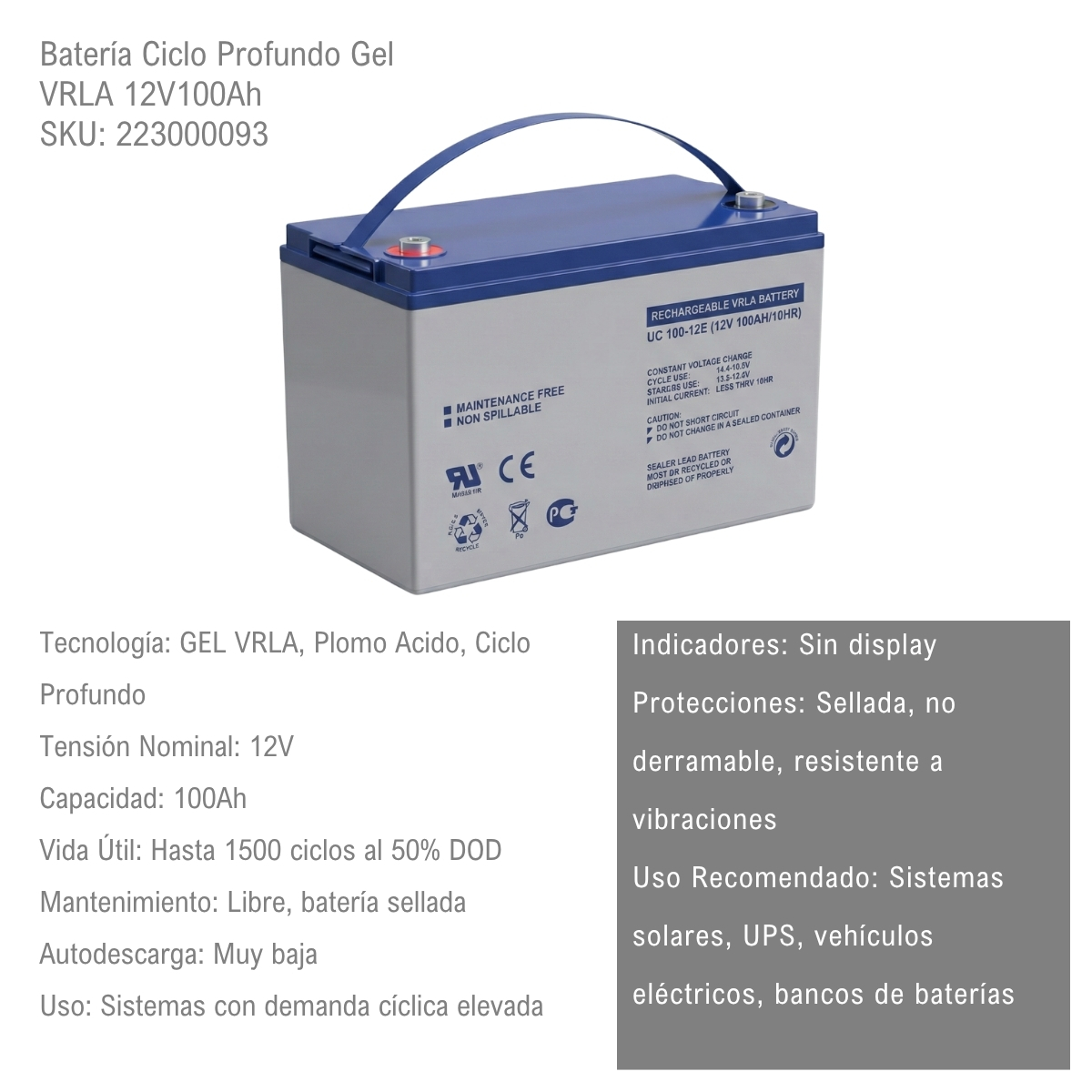 Esta bateria de gel 12V 100Ah ciclo profundo es una solucion confiable y de alto rendimiento para aplicaciones de energia renovable, respaldo UPS, telecomunicaciones, embarcaciones, motorhomes y equipos de consumo medio. Gracias a su tecnologia VRLA y electrolito en gel, es completamente sellada, libre de mantenimiento y apta para operar en interiores. Permite descargas profundas sin dañar su estructura interna y entrega una autonomia estimada de 22.2 horas con consumo continuo de 1000W a 4.5A. Su construccion reforzada resiste vibraciones, impactos y cambios de temperatura. Ideal para sistemas solares o eolicos de 12V, inversores de hasta 1000W, kits portatiles o instalaciones off-grid. Puede instalarse en cualquier posicion sin riesgo de derrames.
