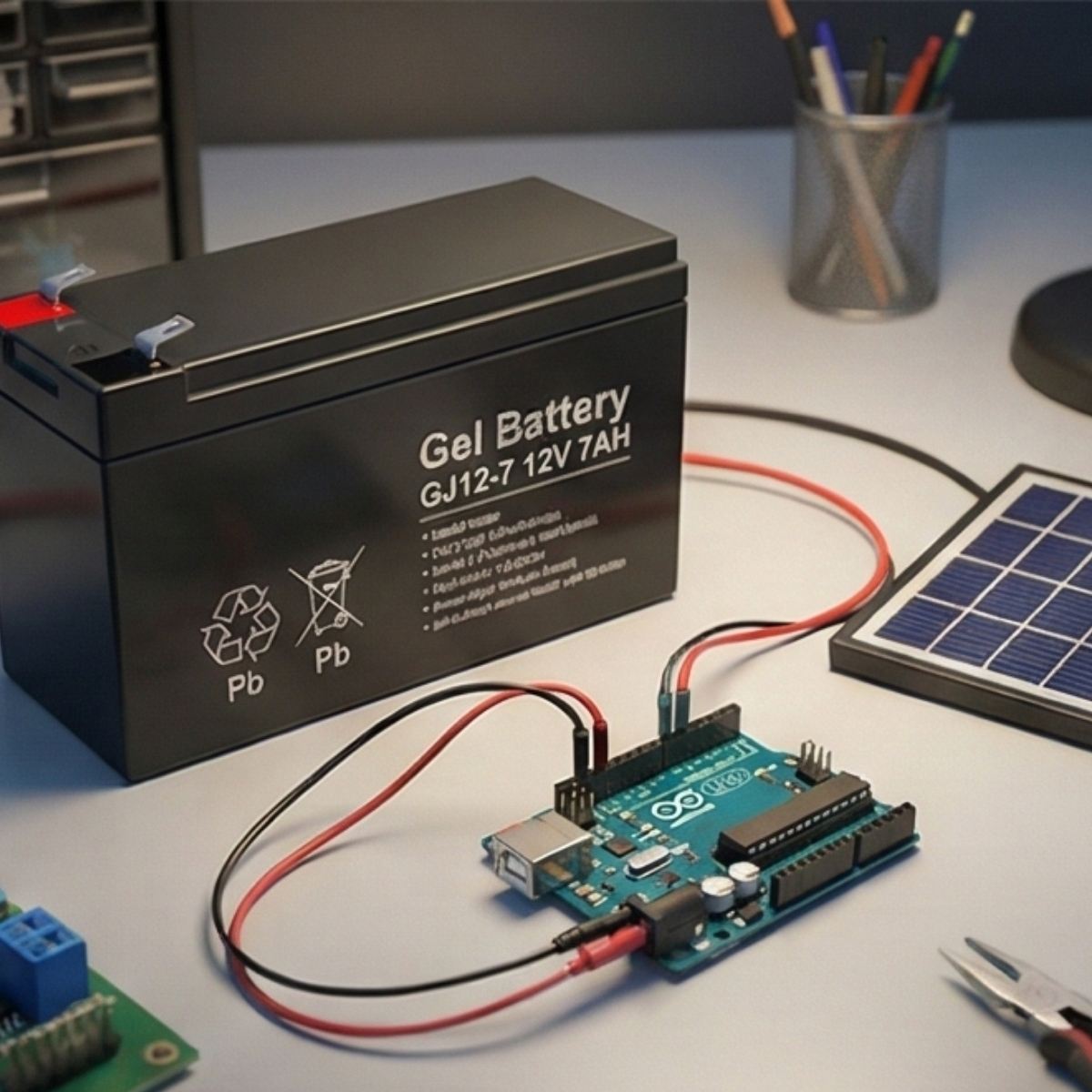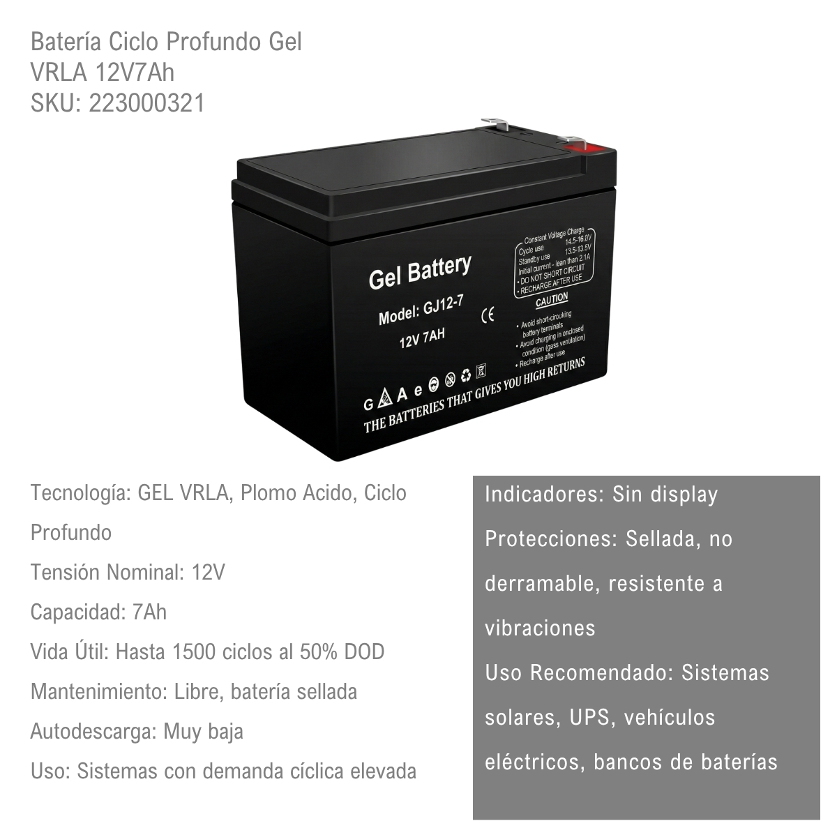 Esta bateria de gel 12V 7Ah ciclo profundo es ideal para aplicaciones de energia solar, respaldo UPS, alarmas, telecomunicaciones, sistemas portatiles y pequeños kits eolicos o solares. Su tecnologia VRLA (valvula regulada) la hace completamente libre de mantenimiento, sin emisiones ni derrames, y apta para uso en interiores. Gracias a su construccion interna con electrolito gelificado, soporta descargas profundas sin afectar su vida util. Ofrece una autonomia de hasta 1,6 horas con consumo constante de 1000W a 4,5A. Es liviana, compacta y se adapta a instalaciones donde el espacio y el peso son factores clave. Su vida util supera los 1500 ciclos al 50% de descarga. Totalmente sellada, es resistente a vibraciones y puede operar en cualquier posicion.