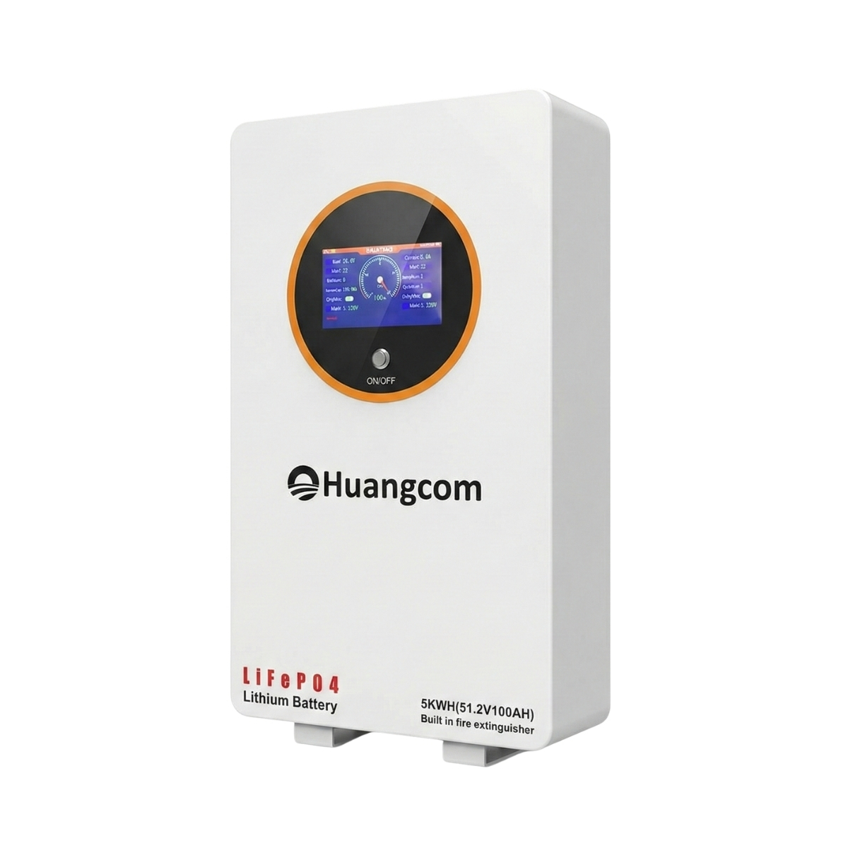 Bateria de litio LiFePO4 de 48V 100Ah mural, disenada para sistemas de almacenamiento de energia solar residenciales y comerciales. Ofrece una capacidad util de 5120Wh, ideal para autoconsumo, backup, telecomunicaciones, movilidad o instalaciones aisladas. Su tecnologia de litio ferro fosfato permite hasta 6000 ciclos al 80 % DOD con alta estabilidad termica y seguridad. Incorpora BMS inteligente con protecciones integradas, pantalla LCD para monitoreo y comunicaciones CAN/RS485 compatibles con inversores hibridos. Puede conectarse en paralelo hasta 15 unidades y cuenta con extintor interno para mayor seguridad. Montaje vertical tipo mural.