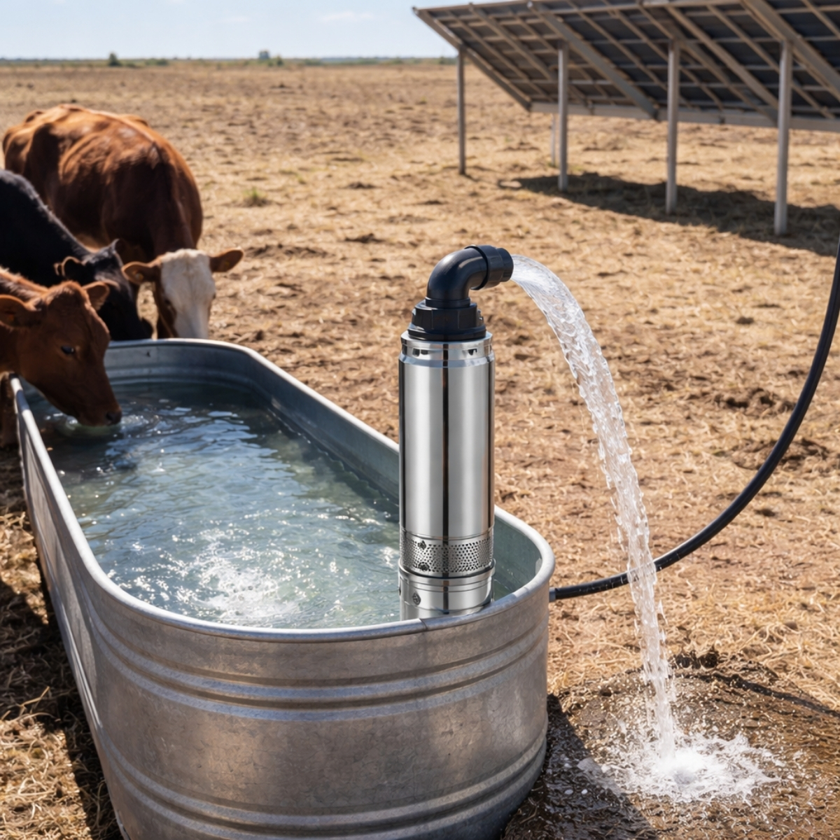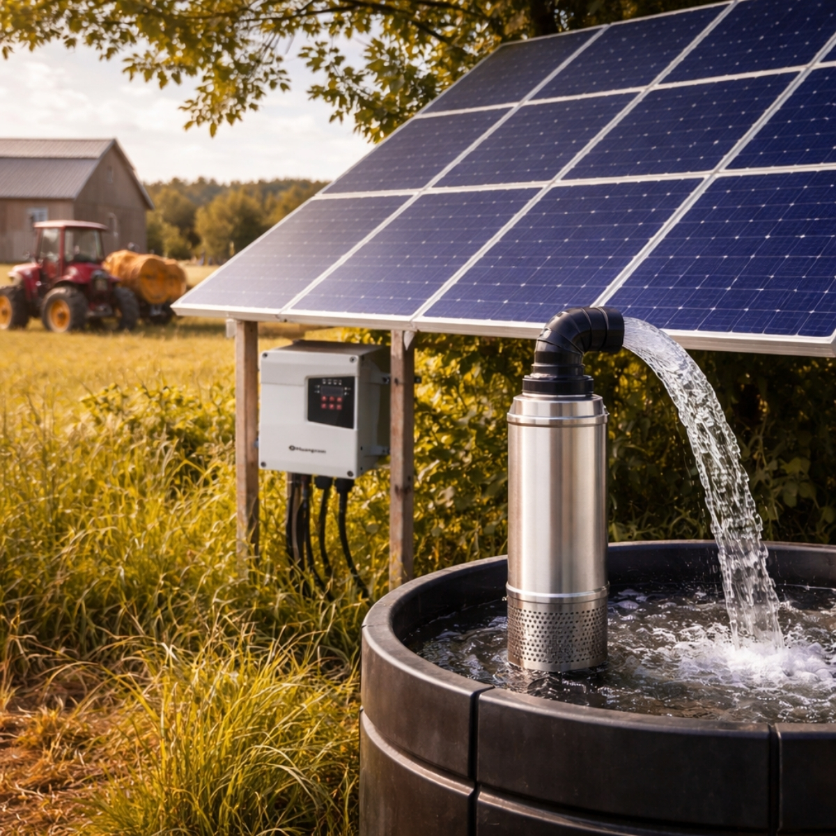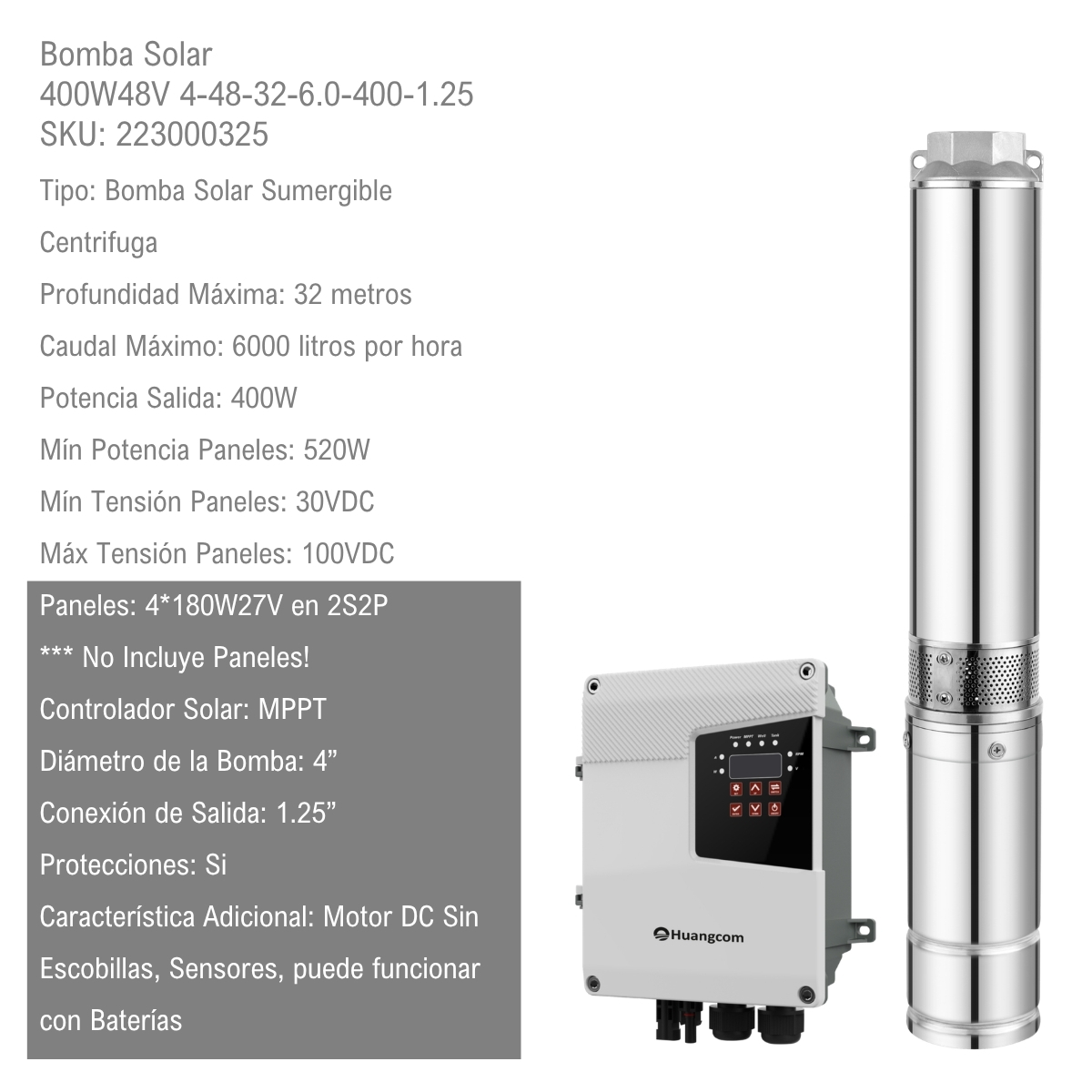 Bomba solar sumergible centrifuga de 400W y 48V, diseñada para extraer agua de pozos profundos hasta 32 metros con gran eficiencia. Con un caudal de hasta 6000 litros por hora, es ideal para riego, abastecimiento en zonas rurales o sistemas de agua autónomos. Su diseño robusto y construcción en acero inoxidable garantizan durabilidad incluso en condiciones exigentes. Incluye controlador solar MPPT que optimiza el rendimiento desde los paneles, sensores y protecciones integradas. El motor sin escobillas mejora la vida útil y permite un funcionamiento más silencioso y eficiente. Compatible con baterías, permite uso continuo incluso con baja irradiación. Puede conectarse con 4 paneles solares de 180W 27V (2 en serie y 2 series en paralelo) para alcanzar su potencia ideal.
