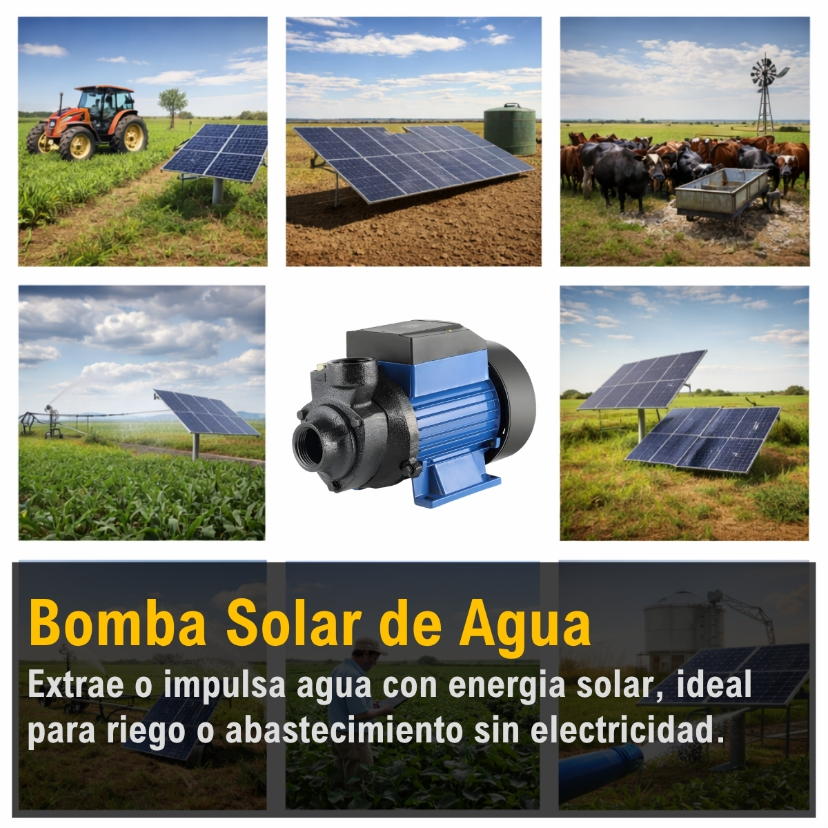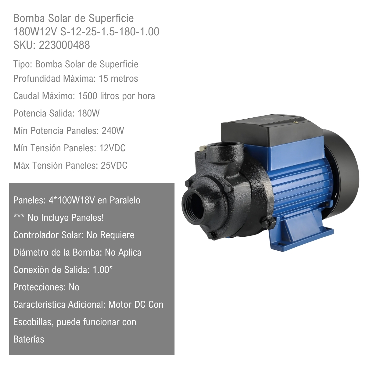 Bomba solar de superficie de 180W a 12V ideal para sistemas de bombeo en viviendas rurales, huertas, ganado o trasvase de agua entre tanques. Diseñada para operar sin red electrica, se alimenta directamente con paneles solares sin necesidad de controlador. Su motor DC con escobillas permite tambien conexion directa a baterias de 12V. Ofrece un caudal de hasta 1500 litros por hora y una altura maxima de bombeo de 15 metros. Su diseño compacto y facil instalacion la convierten en una solucion practica y economica para zonas sin acceso a energia convencional. No apta para aguas con particulas, barro o contaminantes. Requiere ubicacion con buena irradiacion solar para un funcionamiento optimo. Se recomienda utilizar 4 paneles solares de 100W18V conectados en paralelo para asegurar potencia estable y mayor rendimiento en dias parcialmente nublados.