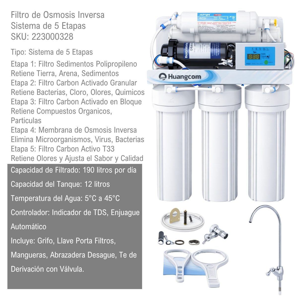 El sistema de filtrado de agua de 5 etapas con osmosis inversa es la solucion definitiva para obtener agua pura y apta para el consumo humano. A diferencia de los filtros convencionales, este sistema utiliza una tecnologia avanzada que realmente potabilizar el agua, eliminando los contaminantes mas peligrosos para nuestra salud.