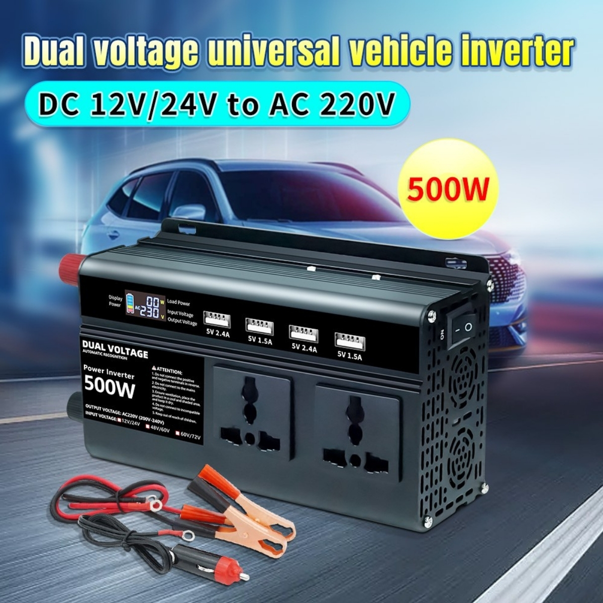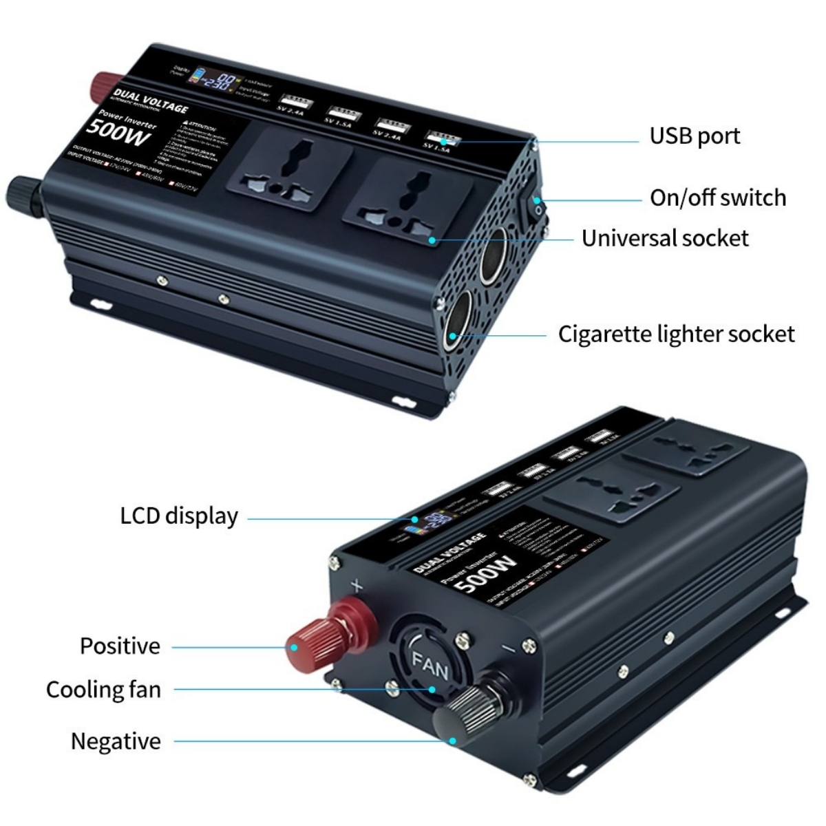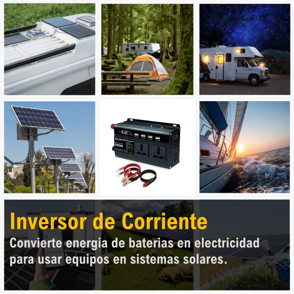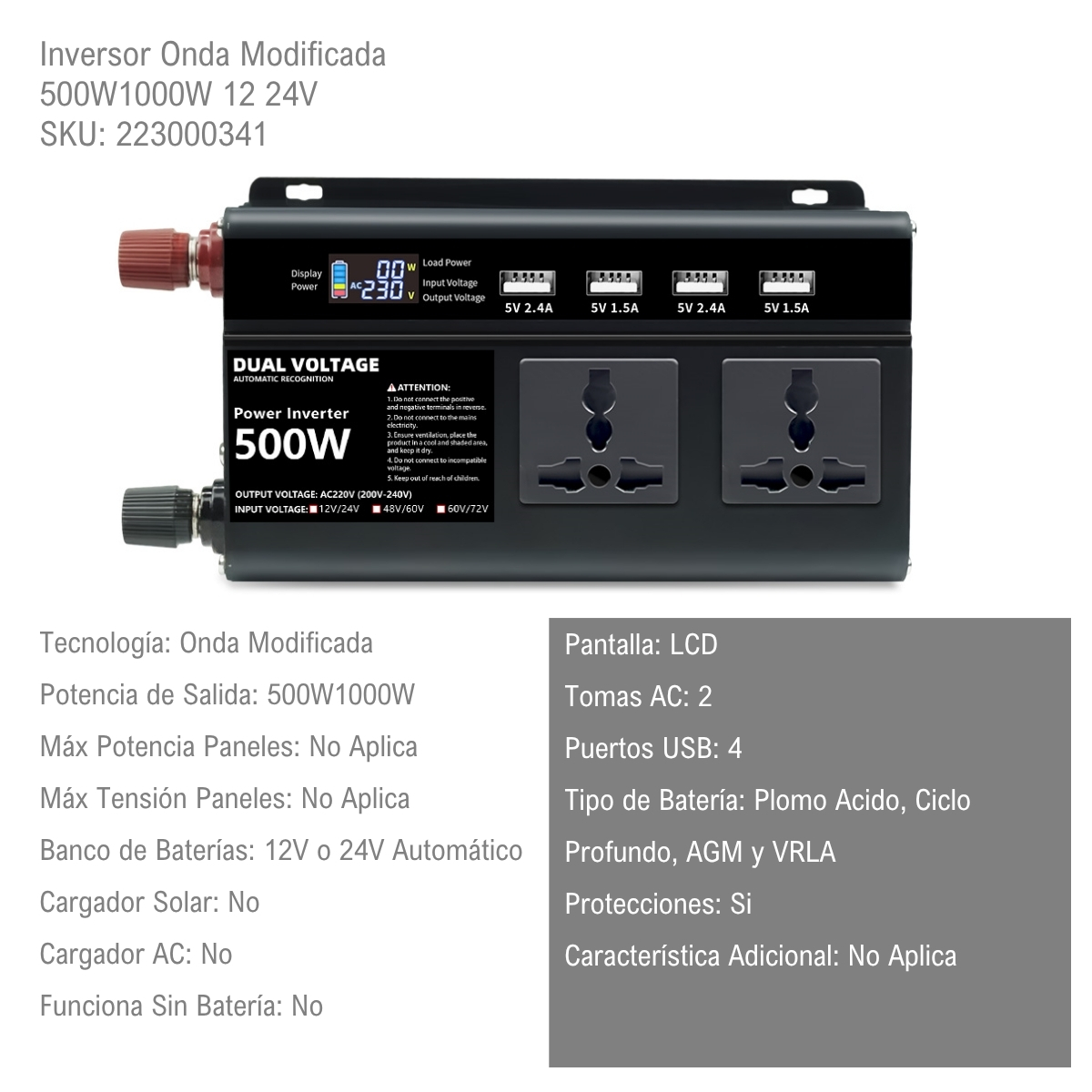 Inversor de uso general para convertir 12V o 24V de bateria a 220V AC, ideal para vehiculos, viajes, camping, cortes de energia y sistemas basicos fuera de red. Entrada dual automatica 12V 24V para instalarlo en distintos bancos sin cambiar de equipo. Onda modificada apta para cargas simples como luces, cargadores, herramientas livianas y electronica de bajo consumo. Pantalla LCD que permite ver tension de entrada, nivel de bateria y carga de salida, evitando fallas por uso incorrecto. Incluye puertos USB y tomas universales para conectar directamente dispositivos habituales sin adaptadores. Proteccion por baja tension para conservar la vida util de la bateria AGM, gel o VRLA. Propuesta simple, portatil y eficiente para aplicaciones donde se prioriza costo y practicidad.