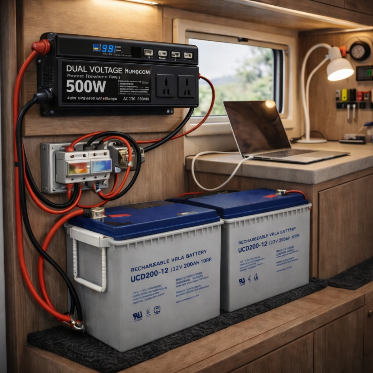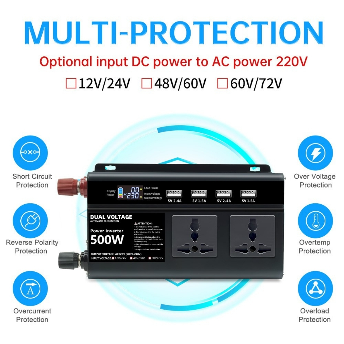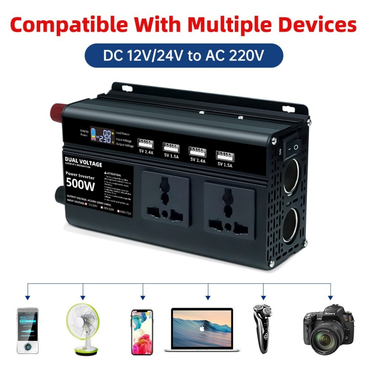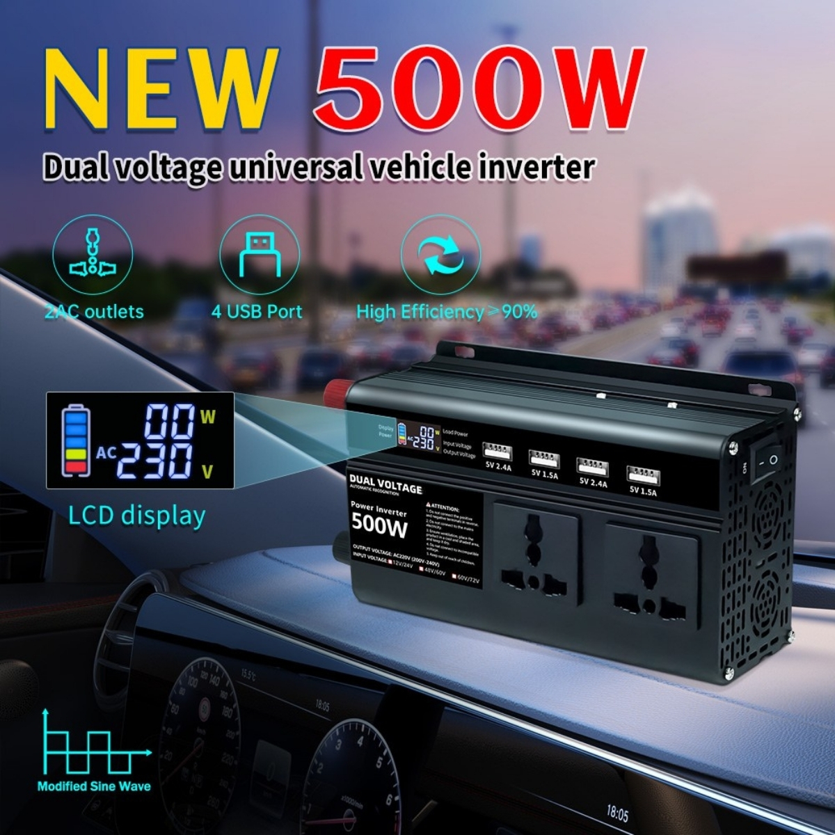 Inversor de uso general para convertir 12V o 24V de bateria a 220V AC, ideal para vehiculos, viajes, camping, cortes de energia y sistemas basicos fuera de red. Entrada dual automatica 12V 24V para instalarlo en distintos bancos sin cambiar de equipo. Onda modificada apta para cargas simples como luces, cargadores, herramientas livianas y electronica de bajo consumo. Pantalla LCD que permite ver tension de entrada, nivel de bateria y carga de salida, evitando fallas por uso incorrecto. Incluye puertos USB y tomas universales para conectar directamente dispositivos habituales sin adaptadores. Proteccion por baja tension para conservar la vida util de la bateria AGM, gel o VRLA. Propuesta simple, portatil y eficiente para aplicaciones donde se prioriza costo y practicidad.