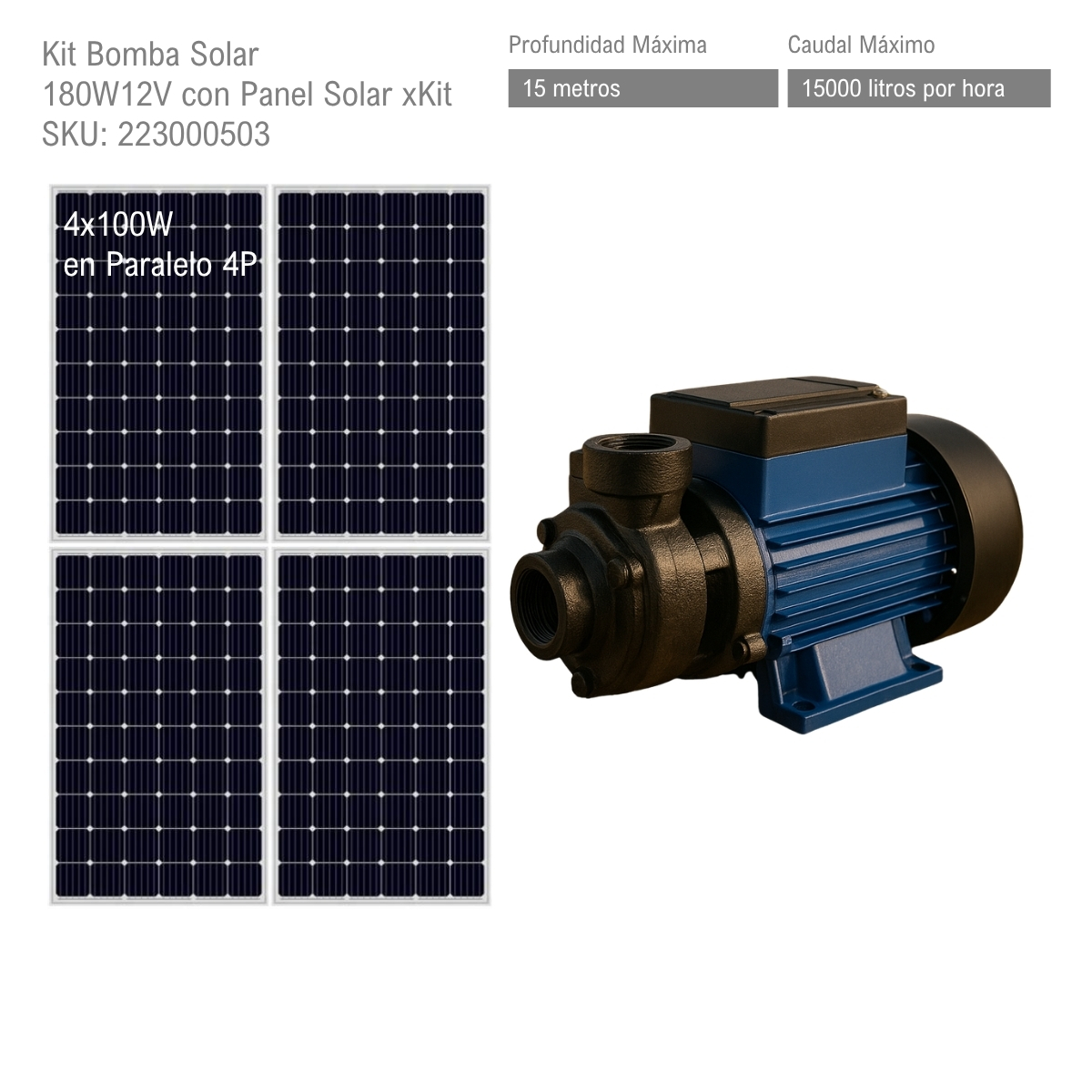 Kit bomba solar de superficie 180W 12V disenado para bombear agua utilizando energia solar en lugares donde no existe acceso a la red electrica. Este sistema permite trasladar o elevar agua de forma totalmente autonoma utilizando unicamente la energia del sol, lo que lo convierte en una solucion ideal para zonas rurales, huertas, pequenos sistemas de riego, bebederos para ganado, llenado de tanques o abastecimiento de agua en lugares remotos. El kit incluye una bomba solar de superficie de 180W12V y cuatro paneles solares monocristalinos de 100W18V que proporcionan la energia necesaria para su funcionamiento. Los paneles se conectan en paralelo para suministrar la corriente adecuada al sistema permitiendo alcanzar un caudal maximo aproximado de hasta 1500 litros por hora con una altura maxima de elevacion de hasta 15 metros dependiendo de las condiciones de instalacion. La bomba funciona directamente con paneles solares y no requiere controlador solar adicional, lo que simplifica la instalacion, reduce costos y mejora la confiabilidad del sistema. Su motor DC con escobillas tambien permite alimentacion mediante baterias de 12V brindando mayor flexibilidad de uso en condiciones de baja radiacion solar o cuando se requiere operar fuera de las horas de sol. Su diseno compacto, simple instalacion y bajo mantenimiento la convierten en una solucion practica y economica para aplicaciones rurales, productivas o domesticas donde se necesite bombear agua utilizando energia solar.