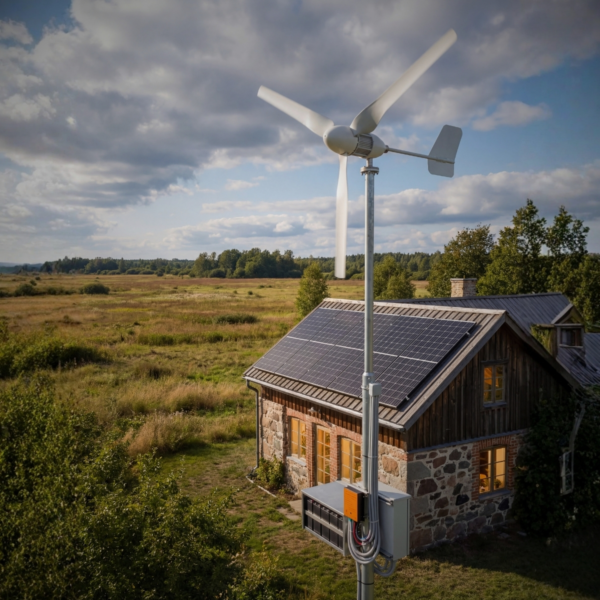 El sistema incorpora 4 paneles solares monocristalinos de 180W que aportan una potencia solar total de 720W y un aerogenerador horizontal de 600W24V capaz de generar energia desde bajas velocidades de viento. Toda la energia generada se gestiona mediante un inversor cargador con regulador MPPT integrado de 3000W que carga un banco de baterias de ciclo profundo de 24V.